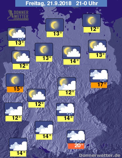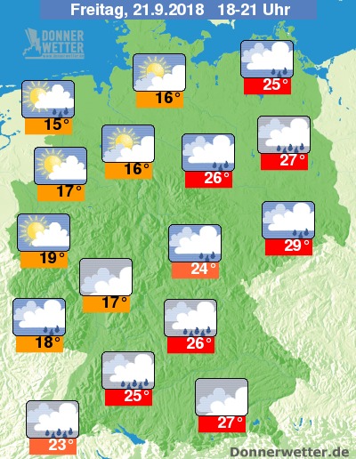 Am Abend regnet es noch in den Gebieten von der Uckermarck, über Sachsen und Thüringen bis zur Schwäbischen-Alb. Vor dem Regen liegen die Temperaturen anfangs noch bei sehr warmen 25 bis 29 Grad. Hinter der Front lockert die Wolkendecke wieder auf und die untergehende Sonne spendet noch einige erhellende Strahlen. Schauer treten nur vereinzelt auf und am ehesten im Küstenbereich der Nordsee. Die Temperaturen liegen im Westen und Nordwesten bei deutlich kühleren 15 bis 19 Grad.