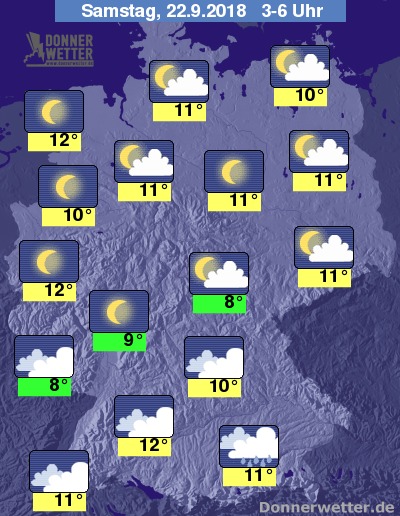 Während der ersten Nachhälfte wandern Regen und Schauer nach Polen und ins südöstliche Bayern ab. Dahinter klart es teilweise auf und die Temperaturen gehen deutlich nach unten. Im Nordseebereich kann es ebenfalls noch zu örtlichen Schauer kommen.
