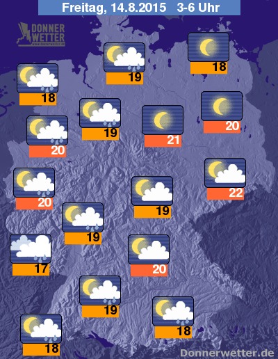 Im Süden und Osten startet der Freitag dagegen meist sonnig. Wo es schauert, steigen die Werte am Morgen auf 17 bis 19 Grad C, in Sachsen nähert sich das Quecksilber bereits in den Morgenstunden der 25-Grad-Marke an.