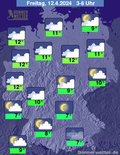 In der Nacht auf Freitag bleibt der Himmel über dem Norden und der Mitte stark bewölkt oder es ist bedeckt, Schauer sind aber weiterhin die Ausnahme. Über den südlichen Landesteilen dominiert nach wie vor lockere Bewölkung oder es ist sternenklar; lokal kann sich Nebel bilden.