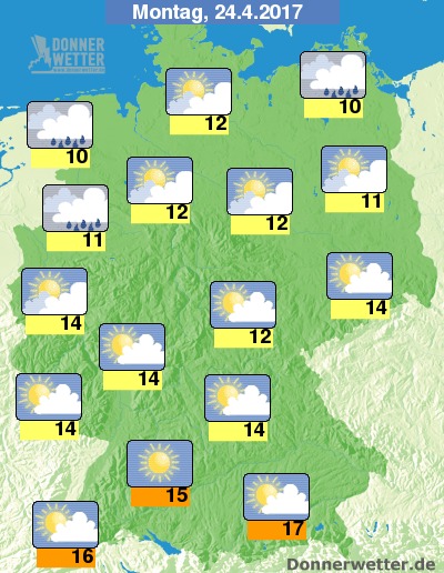 Nach verbreitetem Nachtfrost mit Reif scheint in der Südhälfte für längere Zeit die Sonne von einem meist nur leicht bewölkten Himmel. Die Luft kann sich im Laufe des Nachmittags auf angenehme 14 bis 19 Grad erwärmen. Sonst nimmt die Bewölkung von Nordwesten immer weiter zu und in Norddeutschland fällt bei 10 bis 15 Grad gebietsweise Regen. Hier kann der Wind zum Teil wieder auffrischen. In der Nacht auf Dienstag können sich in der einfließenden Polarluft stellenweise sogar Schneeflocken unter die Tropfen mischen. Gleichzeitig erreicht die Niederschlagszone die mittleren Landesteile.