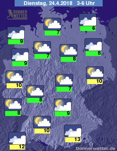 In der kommenden Nacht fällt im Süden anfangs noch gebietsweise Regen, sonst ist es bereits verbreitet nur leicht bis wechselnd bewölkt, im Nordwesten und Nordosten auch teils stark bewölkt, aber trocken. Die Temperatur sinkt auf 13 Grad in München und bis 6 Grad an der Müritz.