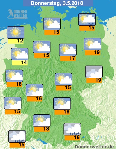 In der Nordwesthälfte auflockernde Bewölkung, im Verlauf meist gering bewölkt und länger sonnig, trocken. In der Südosthälfte dagegen wolkig bis stark bewölkt und einzelne Schauer. Geringes Gewitterrisiko. An den Alpen auch länger schauerartiger Regen. Temperaturmaxima 15 bis 22 Grad, im Nordseeumfeld und lokal im Südwesten nur um 13 Grad. Schwacher, teils mäßiger Nord- bis Nordwestwind.