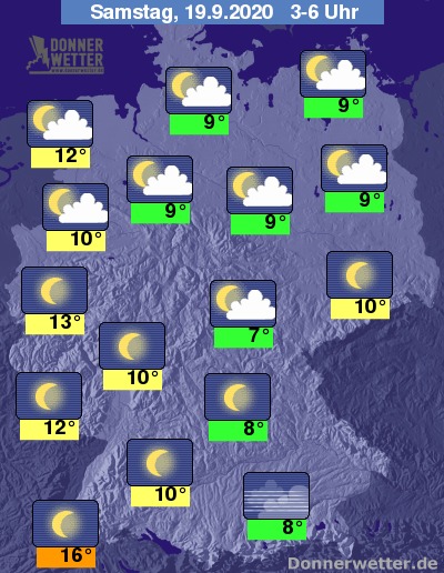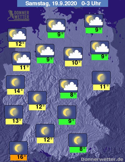 Bis zu den Frühstunden kühlt die Luft auf 13 bis 7 Grad ab, ganz im Südwesten bleibt es mit Werten von über 16 Grad ausgesprochen mild. In einigen geschützten Mittelgebirgstälern kann es jedoch stellenweise leichten Bodenfrost geben.