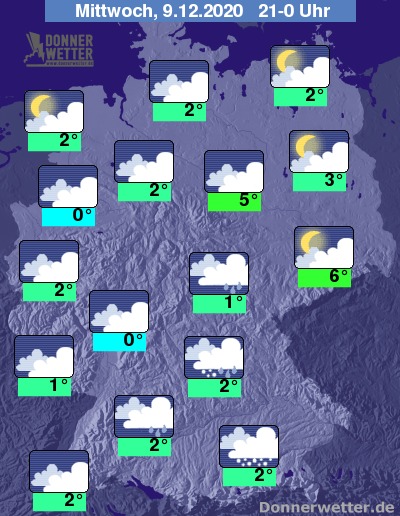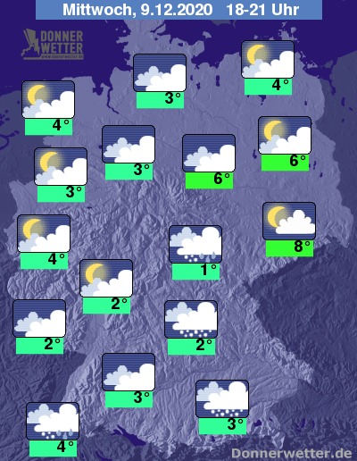 Am Abend fällt von den Alpen bis nach Thüringen leichter bis mäßiger Niederschlag, in höheren Lagen Schnee mit Glättegefahr, in Tiefland eher Regen oder Schneeregen. Sonst bleibt der Himmel überwiegend wolkenverhangen. Lediglich im Westen, sowie im Nordosten lassen sich gelegentlich die Sterne beobachten.