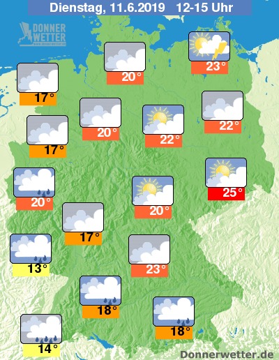Am späten Nachmittag gibt es im Norden und Osten noch größere Aufheiterungen und Gewitterschauer treten zunächst nur vereinzelt in der Osthälfte auf. Im Laufe des Abends werden diese hier jedoch zahlreicher und können dann örtlich sehr kräftig und in Verbindung mit Platzregen, Hagelschlag und stürmischen Böen ausfallen. Sonst werden die Regenfälle im Südwesten im Tagesverlauf insgesamt seltener. Die Wolkendecke bleibt aber meistens geschlossen.