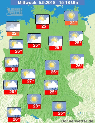 In der sehr warmen und schwülen Luft im Südwesten nehmen Schauer und Gewitter im Laufe des Nachmittags zu. Wegen der windschwachen Wetterlage bleiben die Wolken nahezu an Ort und Stelle stehen und können in kurzer Zeit große Niederschlagsmengen produzieren. Daher muss stellenweise mit Starkregen, Hagelschlag, sowie kleinräumigen Überschwemmungen gerechnet werden. Im übrigen Land wechseln sich Sonne und einige Wolken miteinander ab und es sollte meistens trocken bleiben. Die Temperaturen steigen im Großen und Ganzen noch etwas an und erreichen im Rheinland bis zu 30 Grad. Wesentlich kühler bleibt es im äußersten Nordwesten.