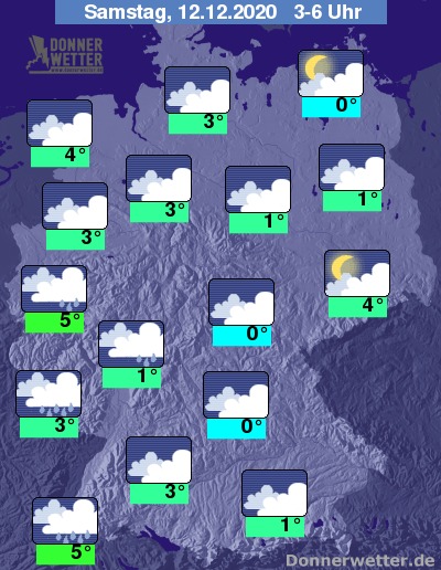 Bis zu den Frühstunden kühlt die Luft im Vergleich zum Abend kaum ab, so dass die Werte weiterhin zwischen 0 und 5 Grad liegen. Leichten Frost gibt es daher nur in Bayern und Thüringen, sowie dort, wo der Himmel etwas aufklart.
