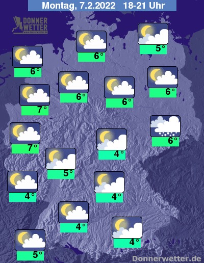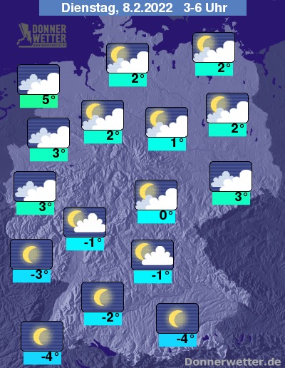 In der Nacht zum Dienstag ist es über dem Süden meist sternenklar, sonst ist es anfangs oft locker bis wechselnd, im Norden schon meist stark bewölkt. Im Laufe der Nacht zieht sich der Himmel über der Nordhälfte mehr und mehr zu, dazu bleibt es aber weitgehend trocken. Die Temperatur sinkt auf 5 Grad in Emden und bis -4 Grad in München. An der Ostsee ist es oft stürmisch, an der Nordsee herrscht zum Teil Sturm.
