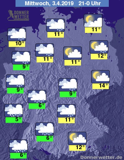 Die Temperaturen bewegen sich zu Dämmerungsbeginn zwischen 8 und 15 Grad, am kühlsten bleibt es dabei im Südwesten. Ganz im Osten werden meist noch zwischen 15 und 18 Grad erreicht.