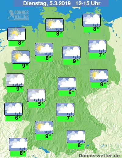 Am Nachmittag dominieren meist kompakte Wolken. Zeit- und Gebietsweise fällt Regen oder es treten Schauer auf. In höheren Lagen der Mittelgebirge können sich Schneeflocken oder Graupelkörner unter die Tropfen mischen. Nur regional gibt es längere trockene Abschnitte mit einigen freundlichen Phasen.