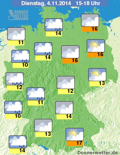 Mit dichten Wolken und Schauern steigen im Westen die Temperaturen so nur auf Werte um 10 bis 14 Grad C, am Alpenrand mit Föhn nochmals um 17 Grad C.