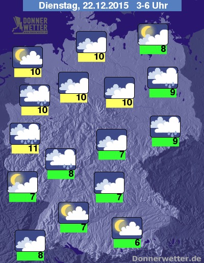 In der Nacht zum Dienstag ist es im Süden der Republik meist locker oder aufgelockert bewölkt und trocken. Sonst halten sich zunächst weitgehend dichte Wolken, aus denen immer wieder, teils kräftiger Regen fällt. Gegen Morgen klingen die Niederschläge im Norden meist ab und hier und da kann die Bewölkung auch auflockern. Die Temperatur sinkt auf 11 Grad in Aachen und etwa 6 Grad in München. Im Norden weht starker und teils stürmischer Wind mit möglichen Sturmböen, an den Küsten und auf den Bergen herrscht Sturm, dabei sind orkanartige Böen möglich.