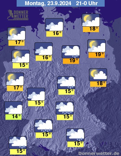 In der Nacht zum Dienstag verlagern sich die Regengebiete zunehmend in die Osthälfte, von südlich Baden-Württemberg bis nach Thüringen muss dann mit anhaltendem und teils kräftigem Regen gerechnet werden. In den übrigen Landesteilen bleibt es bei überwiegend wechselnder Bewölkung meist niederschlagsfrei.