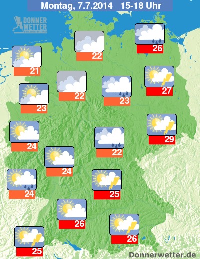 Heute Nachmittag entwickeln sich vor allem in der Südosthälfte Deutschlands verbreitet Schauer und Gewitter, nach Nordwesten hin ist es dagegen bei meist aufgelockerter Bewölkung weitgehend trocken. Die Temperatur liegt bei 20 Grad auf den Nordseeinseln und etwa 29 Grad in der Lausitz.