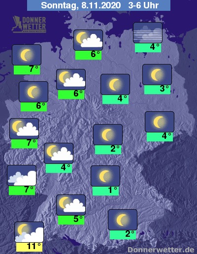 Die Temperaturen sinken auf Werte um 7 Grad entlang des Rheins und 1 Grad in Franken. Am mildesten bleibt es mit Werten um 10 Grad im Breisgau.