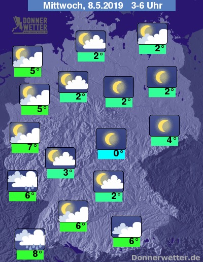 Die Luft kühlt bis zu den Frühstunden über der Landesmitte und im Nordosten auf sehr frische 0 bis 3 Grad ab. Stellenweise gibt es leichten Frost. Im Süden und Westen bleibt es mit 4 bis 8 Grad milder.