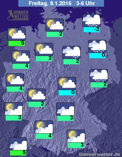 In der Nacht zum Freitag ziehen sich Regen, Schneeregen und Schnee in den Norden und Osten Deutschlands zurück und sorgen hier weiterhin für verbreitete Straßenglätte! Sonst lockert der Himmel jedoch meist auf und es bleibt dann weitgehend trocken. Im Süden halten sich die Wolken meist dicht, jedoch bleibt es auch hier weitgehend trocken. Die Temperatur sinkt auf 5 Grad in Freiburg und bis -2 Grad an der Müritz. Über der Nordhälfte weht ein zum Teil starker Wind, auf den Bergen der Mittelgebirge und an der See herrscht teils Sturm.