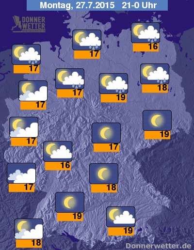 In der Nacht zum Dienstag ziehen besonders in den westlichen Landesteilen oft dichte Wolken durch, dabei fällt auch zeitweise Regen. Im Süden sind bei teils dichten Wolken einzelne Schauer möglich. Im übrigen Deutschland ist es hingegen meist locker bewölkt oder auch sternenklar und weitgehend trocken. Die Temperatur sinkt auf 15 Grad in Riesa und bis 11 Grad im Grabfeld.