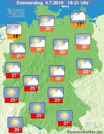 Die Temperaturen liegen am frühen Abend zwischen 17 und 23 Grad im Norden und Osten, sowie zwischen 24 und 29 Grad im Süden und Westen.