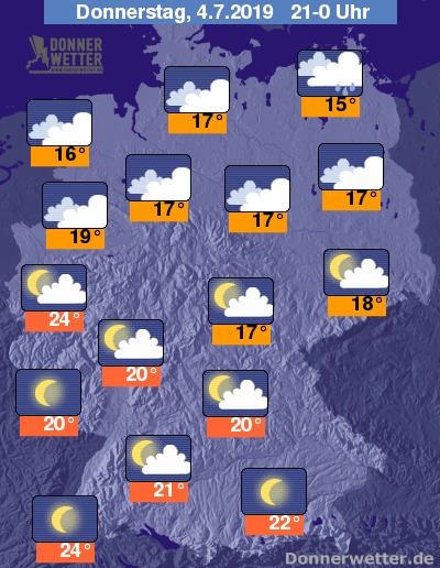 Bis zu den Frühstunden gehen die Temperaturen auf 10 Grad im Thüringer Becken und 16 Grad im Breisgau, sowie in den Ballungsgebieten des Westens zurück.