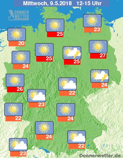 Heute Nachmittag ist es über dem Land weitgehend heiter bis sonnig, regional und vor allem über dem Osten und am Alpenrand bilden sich dichte Quellwolken, dabei sind einzelne Schauer und zum Teil kräftige Gewitter möglich, sonst bleibt es noch weitgehend trocken. Die Temperatur liegt bei 20 Grad an der Nordsee und etwa 27 Grad in Berlin.