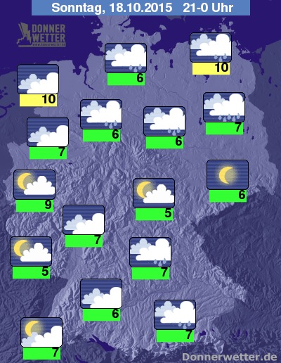 Heute Abend ziehen über den Norden Deutschlands verbreitet dichte Wolken und es fällt teils langanhaltender Regen. Über der breiten Mitte der Republik zeigt sich der Himmel hingegen größtenteils locker bewölkt oder auch sternenklar und es ist trocken. Weiter nach Süden hin ziehen wiederum meist dichte Wolken durch und es fällt gebietsweise Regen. Die Abendtemperatur liegt bei 10 Grad in Vorpommern und um 5 Grad in der Wetterau.