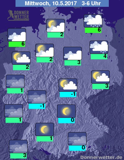 In der Nacht zum Mittwoch ist der Himmel über der Südwesthälfte der Bundesrepublik verbreitet sternenklar und dazu trocken, dazu sinken die Temperaturen meist auf Werte um den Gefrierpunkt. Im Norden und Osten bleibt es hingegen überwiegend stark bewölkt und von Mecklenburg-Vorpommern bis Brandenburg fällt zeitweise Regen, sonst bleibt es meist trocken und bei Tiefstwerten zwischen 6 und 2 Grad wird es nicht ganz so kalt.