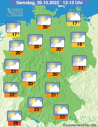 Heute Nachmittag ist es vor allem im Süden zumeist heiter. Im übrigen Bundesgebiet zeigt sich das Wetter hingegen oft trüb oder stark bewölkt, gebietsweise heitert es aber auch auf. Es bleibt überall trocken bei 17 Grad in Neubrandenburg und bis 26 Grad in Freiburg.