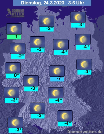 Die Temperaturen sinken, ausgenommen die Nordseeküste, meist überall in den Frostbereich; die Tiefstwerte liegen dann bei 0 Grad in der Kölner Bucht und um -7 Grad in Franken. Auf den Gipfeln der Mittelgebirge sowie in den Alpen fällt das Thermometer auch auf Werte um -10 Grad.