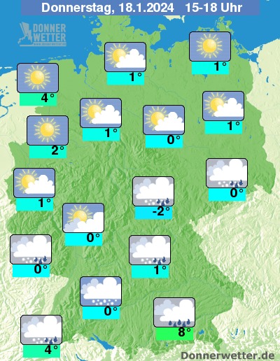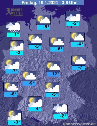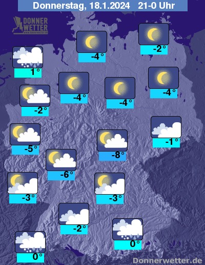 Die Temperaturen gehen bis Mitternacht auf Werte um 1 bis -8 Grad zurück, in den frühen Morgenstunden des Freitag Tiefstwerte um 1 Grad an der Nordseeküste und -12 Grad in Erfurt.