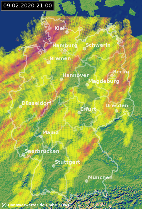 Die Gewitterbänder mit Orkanböen sind im Radar gut zu sehen.