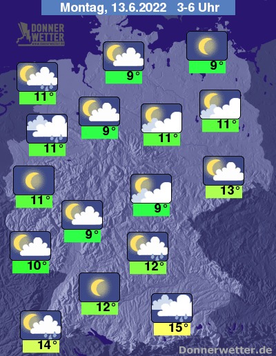 In der folgenden Nacht ziehen aus Nordwesten vorübergehend dichte Wolken durch, dabei bilden sich im Süden und in der zweiten Nachthälfte auch im Nordwesten gebietsweise Schauer, im Süden sind auch lokale Gewitter möglich. Im übrigen Land ist es zwar auch teils stark bewölkt, jedoch auch oft locker bewölkt oder sternenklar und es bleibt weitgehend trocken. Die Temperatur sinkt auf 15 Grad in München und 9 Grad in Hamburg.