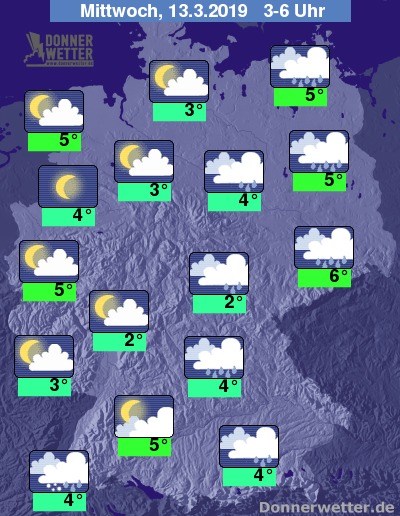 In der Nacht zeigt sich der Himmel zunächst noch vielerorts bedeckt und verbreitet fällt Regen, der vor allem im Süden und Osten auch kräftiger ausfallen können. Im Südwesten können sich auch örtliche Schneeregen- oder Schneeschauer mit einmischen. Die Schneefallgrenze sinkt in der Nacht auf 400 bis 600 m.