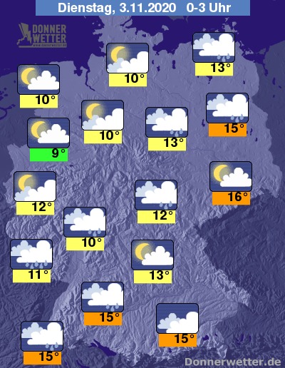 Die Temperaturen gehen in der Nacht auf Werte meist um 12 bis 9 Grad zurück. Am mildesten bleibt es zunächst noch an den Alpen sowie im äußersten Südosten mit Werten teils um 16 Grad.