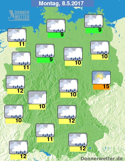 Am Montag zeigt sich der Himmel überwiegend stark, zeitweise aber auch mal aufgelockert bewölkt. Besonders im Süden bilden sich häufige, sonst eher einzelne Schauer. Die emperatur erreicht nur 9 Grad in der Norddeutschen Tiefebene und bis 15 Grad in Dresden.