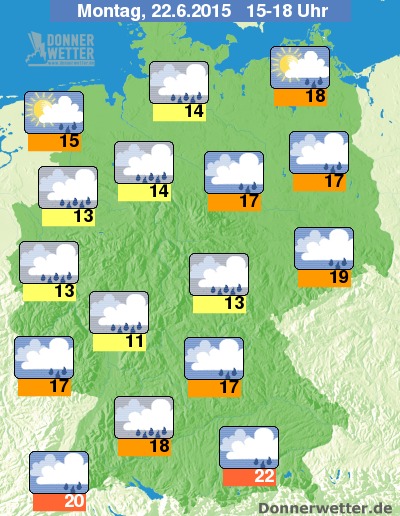 Heute Nachmittag ziehen verbreitet dichte Wolken durch und es zeigen sich nur selten Auflockerungen am Himmel. Dazu fällt immer wieder, oft auch schauerartiger Regen. Im Norden und Westen sind zudem Gewitter möglich. Die Temperatur steigt auf teils nur 11 Grad im Westerwald und bis 22 Grad in München.