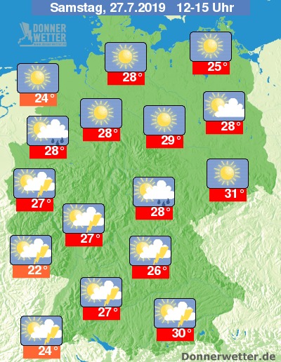 Heute Nachmittag bleibt es über dem Norden und Osten verbreitet heiter bis sonnig und trocken, sonst ziehen dagegen oft dichte, teils aufgelockerte Wolken durch und es können sich vielerorts Schauer und mögliche Gewitter bilden. Die Temperatur liegt bei 22 am Pfälzer Wald und bis 31 Grad in Dresden.