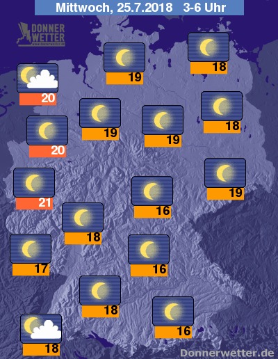 In der Nacht zum Mittwoch klingen mögliche Schauer am Schwarzwald meist rasch ab und der Himmel lockert auf. Im übrigen Bundesgebiet ist es verbreitet sternenklar, im Nordseeumfeld oft locker bewölkt, dazu bleibt es trocken. Die Temperatur sinkt auf tropische 21 Grad in Köln und bis 16 Grad in Mittelfranken.
