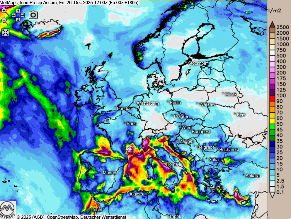 Die akkumulierten Niederschlagsmengen in Europa bis 26.12. nach ICON und die Strömungs- sowie Wetter- und Temperaturkarte für Samstagfrüh nach GFS: