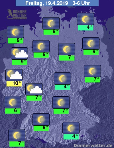 Bis zu den Frühstunden kühlt die Luft auf 4 bis 7 Grad ab, stellenweise kann es aber noch zu leichtem Bodenfrost kommen. Im Westen und Nordwesten bleibt es mit 8 bis 10 Grad milder.