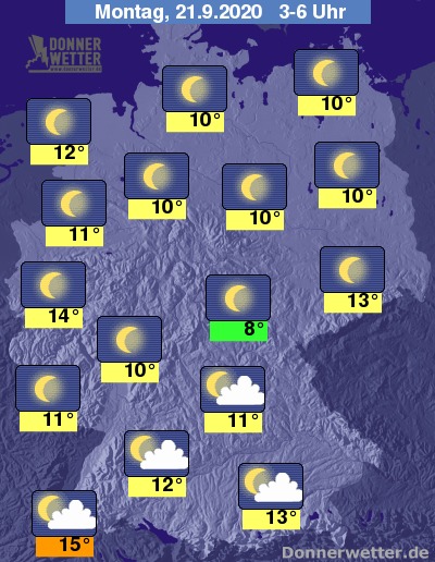 In der Nacht zum Montag klingen letzte Schauer am Alpenrand ab und im weiteren Verlauf lockert es auch hier immer mehr auf. Im übrigen Süden ist es meist locker bis wechselnd bewölkt. Im übrigen Bundesgebiet ist es verbreitet sogar sternenklar, dazu bleibt es trocken. Die Temperatur sinkt auf milde 15 Grad am Oberrhein und bis auf etwa 8 Grad m Grabfeld.