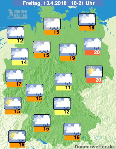 Die Höchstwerte liegen dazu zwischen kühlen 11 Grad im Thüringer Bergland und leicht schwülen 20 Grad im Großraum Berlin.