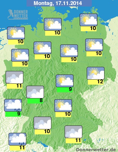 Am Montag ziehen besonders im Süden und Südwesten Deutschlands häufig dichte Wolken durch, die jedoch nur vom Saarland bis rund um den Schwarzwald hier und da etwas Regen bringen, sonst bleibt es weitgehend trocken. Von der Mitte bis in den Norden des Landes ist es dagegen meist locker oder aufgelockert bewölkt und es bleibt trocken. Die Temperatur steigt auf etwa 8 Grad am Pfälzer Wald und bis 12 Grad in Leipzig.