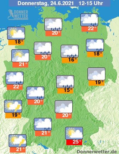 Heute Abend ist es vielerorts stark, hier und da auch aufgelockert bewölkt, dabei bilden sich im Süden und Westen wiederholt Schauer und lokal auch Gewitter. Über der Nordosthälfte fällt gebietsweise Regen. Die Temperatur liegt bei 14 Grad im Thüringer Becken und bis 25 Grad im Rheinland.