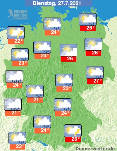 Am Dienstag ist es im Osten zunächst noch meist heiter und trocken. Sonst und im übrigen Land zieht hingegen wechselnde bis starke Bewölkung durch, dabei bilden sich hier und da einzelne Schauer. Örtlich sind auch Gewitter möglich. Die Temperatur steigt auf 21 Grad in Saarbrücken und bis 27 Grad in Dresden.