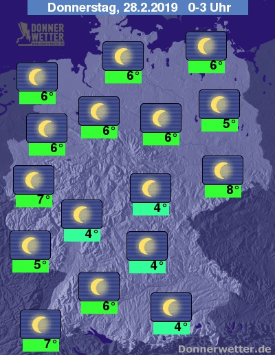 In der Nacht bleibt der Himmel über dem Land überwiegend sternenklar, Wolken sind die absolute Ausnahme. Die Temperaturen sinken auf Werte um 8 Grad C in Leipzig und um 3 Grad C in Mittelfranken.