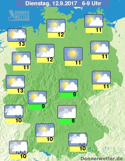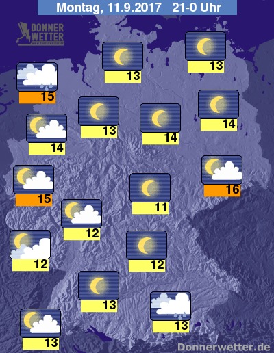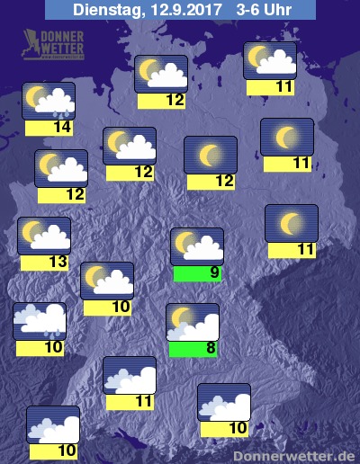 In den frühen Morgenstunden bleibt der Himmel über der Osthälfte des Landes sternenklar, sonst dominieren lockere Wolken, die nur im äußersten Nordwesten sowie im Saarland auch mal Schauer im Gepäck haben können. Entlang der Donau zeigt sich der Himmel überwiegend bedeckt.