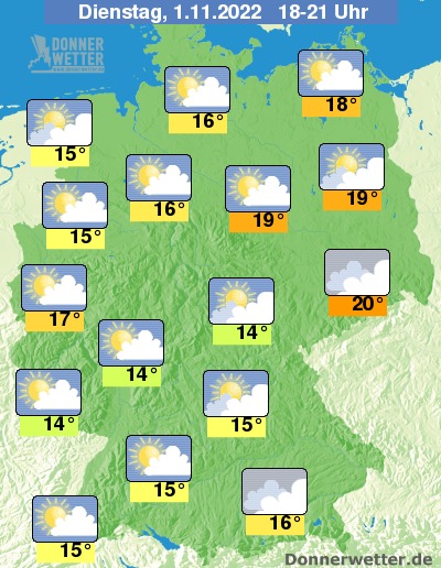 Heute Abend zeigt sich das Wetter über der Westhälfte verbreitet wolkenlos bis locker bewölkt. Weiter nach Osten hin halten sich jedoch überwiegend noch dichte Wolken, aber auch hier bleibt es trocken. Die Temperatur liegt bei 14 Grad in Saarbrücken und 20 Grad in Dresden. An der Nordsee weht der Wind oft stürmisch.