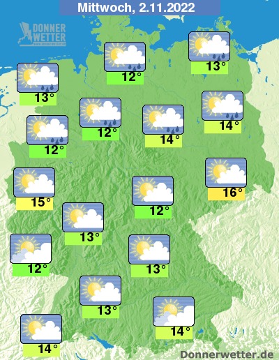 Am Mittwoch ist es im Norden oft stark bewölkt und es bilden sich örtliche Schauer. Weiter nach Süden hin ist es hingegen überwiegend heiter bis sonnig, teilweise auch trüb oder stark bewölkt. Es bleibt trocken bei 12 Grad am Pfälzer Wald und bis 16 Grad in der Niederlausitz. An den Küsten weht ein oft stürmischer Wind.